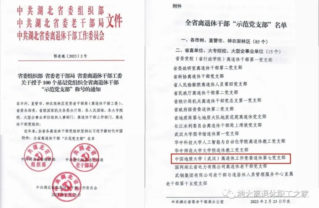 近日,湖北省委组织部、省委老干部局、省委离退休干部工作委员会联合发文,授予公司离退休工作党委第七退休党支部为全省离退休干部“示范党支部”称号。这是继退休第五党支部之后,公司第二个获得省级“示范党支部”荣誉的离退休干部党支部。这是公司离退休党建工作争先创优的一个缩影,彰显出公司离退休党支部争先创优氛围日益浓厚,地大银发先锋党建品牌日益响亮。